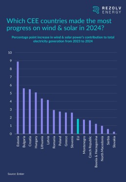 There is one other important detail about these figures which cannot be read from this graph. Almost all of the wind and solar additions last year were, in reality, solar power capacity. In 2024, wind energy’s contribution to total electricity generation only increased by more than 1% in two CEE countries: Estonia (+5.58%) and Croatia (+2.27%)