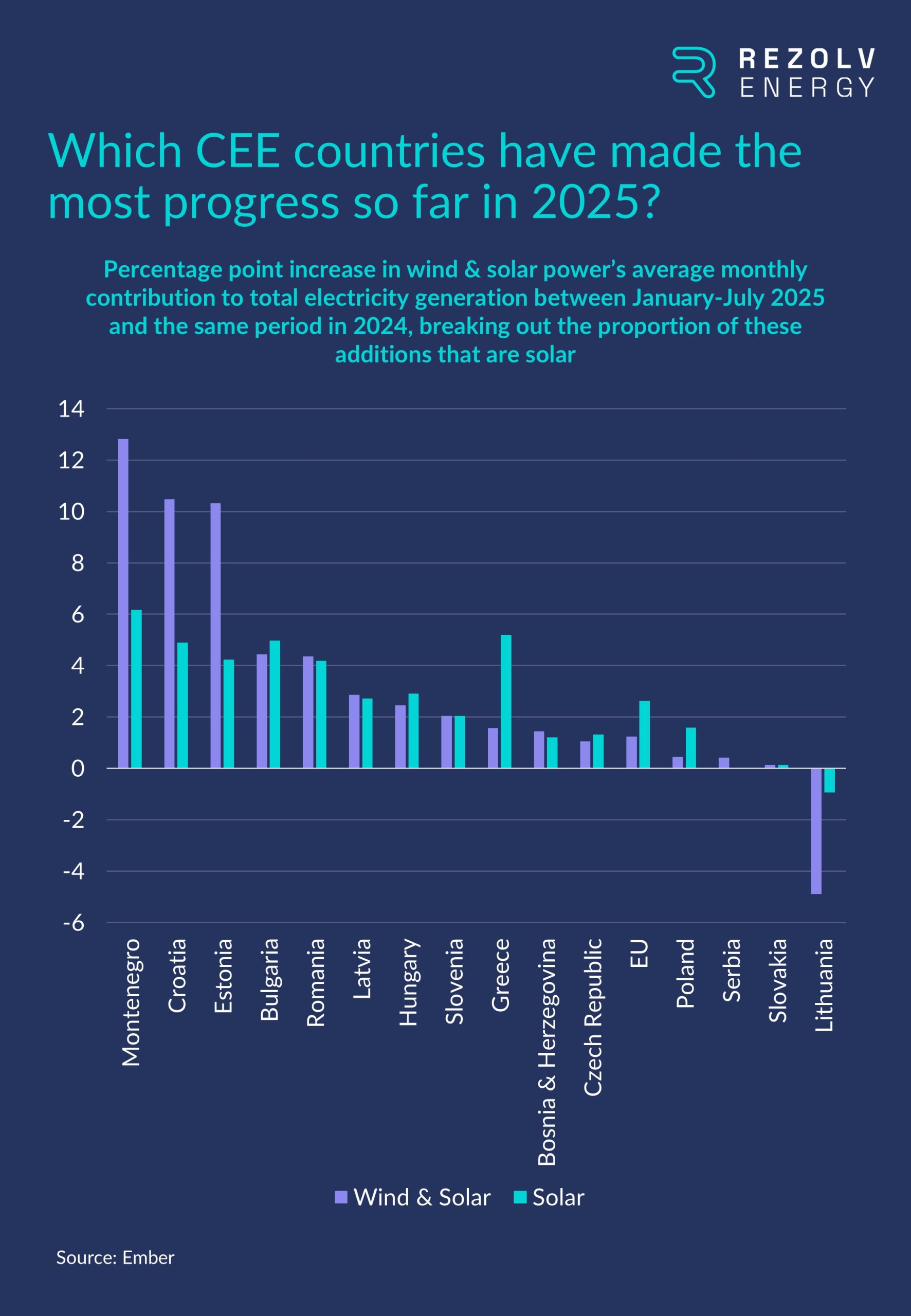 The positive news here is that five countries added more than 4% of wind and solar on average between January and July – notably better than both the rest of CEE and the EU average: Montenegro (+12.8%), Croatia (10.5%), Estonia (10.3%), Bulgaria (4.5%) and Romania (4.4%).