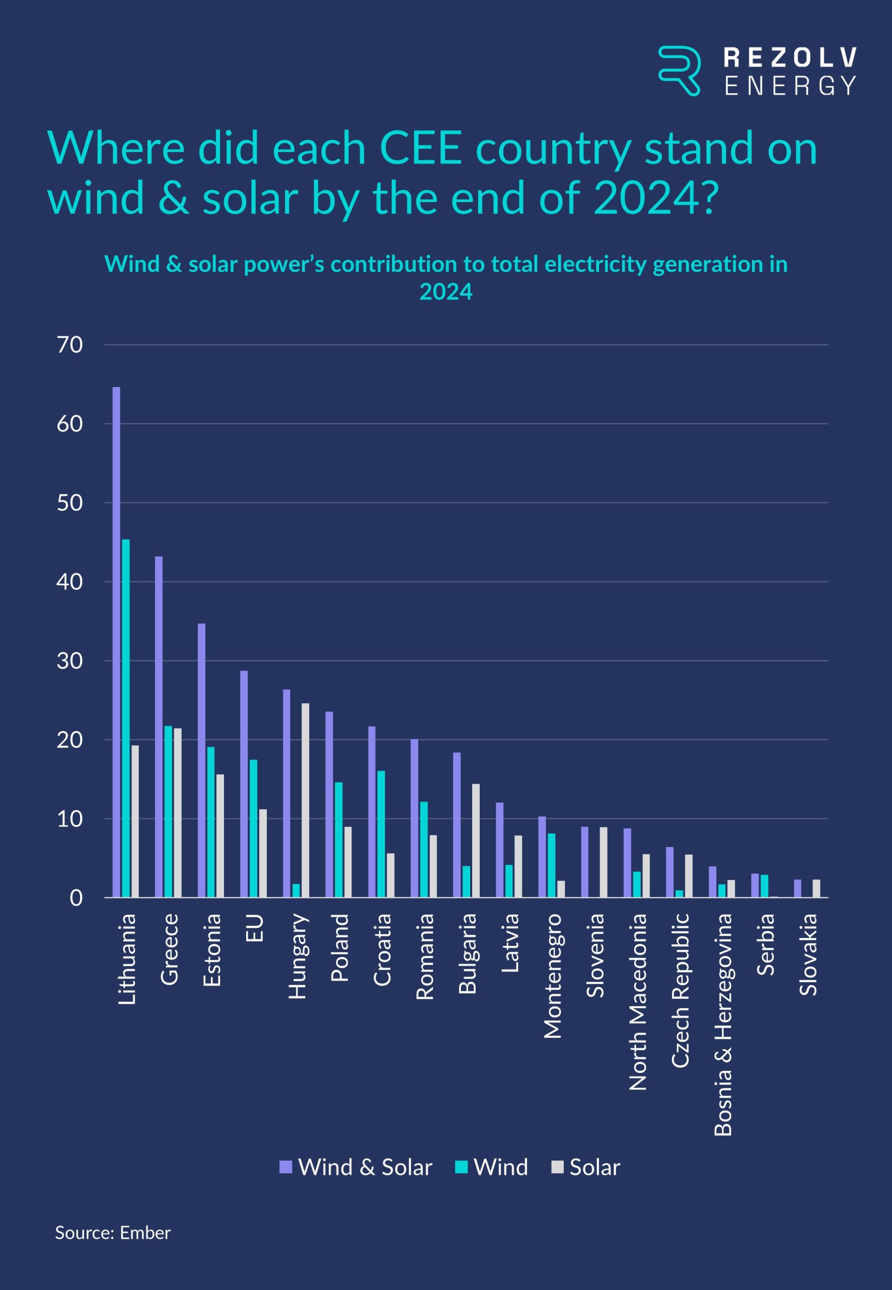 There is one other important detail about these figures which cannot be read from this graph. Almost all of the wind and solar additions last year were, in reality, solar power capacity. In 2024, wind energy’s contribution to total electricity generation only increased by more than 1% in two CEE countries: Estonia (+5.58%) and Croatia (+2.27%)