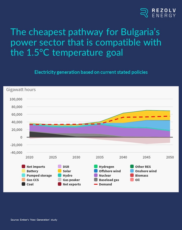 Indeed, based on a study by Ember, the cheapest pathway for Bulgaria’s power sector which is compatible with the 1.5°C temperature goal mentioned in the letter involves the installation of huge amounts of solar and onshore wind: