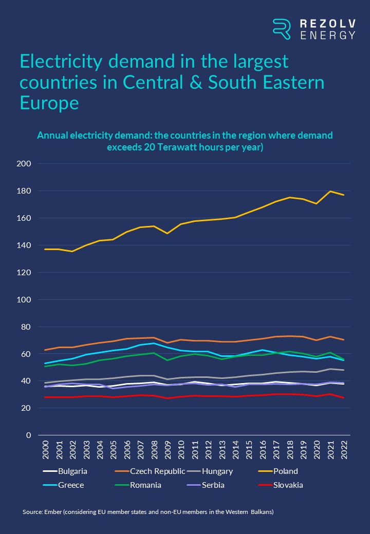 This will be particularly challenging for the largest and most heavily industrialised countries. If you take ‘Central & South Eastern Europe’ to mean the EU member states in the region plus the non-EU countries in the Western Balkans, there are only four countries where annual electricity demand exceeds 50 Terawatts – Poland, the Czech Republic, Romania and Greece: