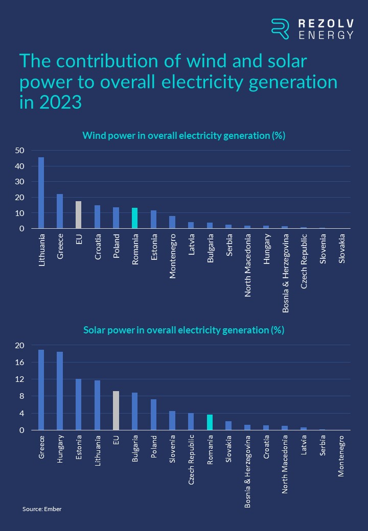 To put that into a regional context, here’s how Romania stacked up against other countries in Central & South Eastern Europe in 2023 in terms of both wind and solar capacity:
